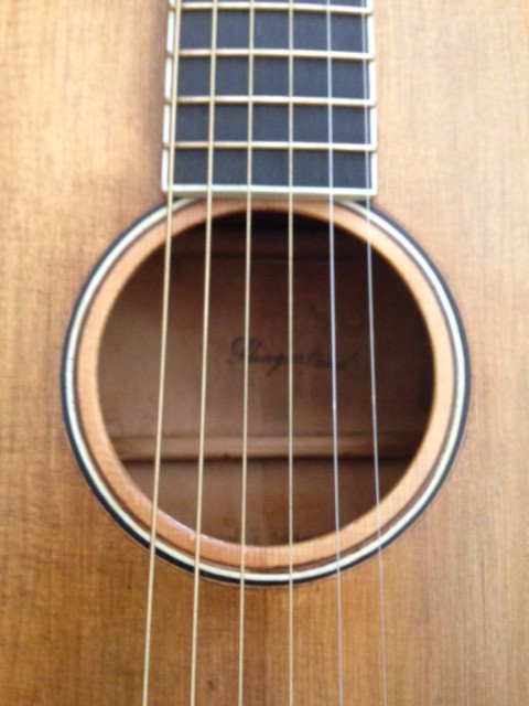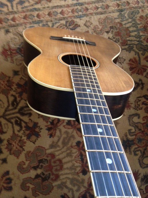 New spruce top from my 30-year-old stash. I used the original bridge, but replaced the original fret-wire saddle with bone. Re-braced with a light X-bracing pattern to handle steel strings. Ivoroid binding top, back, and fret board. Historically accurate tuning machines from StewMac. I can’t stand cheap tuners and these are great! All in all, probably too many upgrades from the original condition, but what a joy to play! SLINGERLAND, MAN!