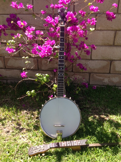 Some time ago I came by a no-name-brand banjo mandolin with a variety of problems: missing hardware, busted head, etc. It sat in my “to-do” pile for about five years until it occurred to me that I really needed a 5-string banjo, and one way to get one would be to make a new neck for the banjo-mando body. So, after the transformation, here it is. Whoever thought it was a good idea to marry a banjo with a mandolin was clearly tonally-challenged. Believe me, the world is better for there being one less banjo-mando. Of course, now I have three different kinds of banjos, so that might be a problem.