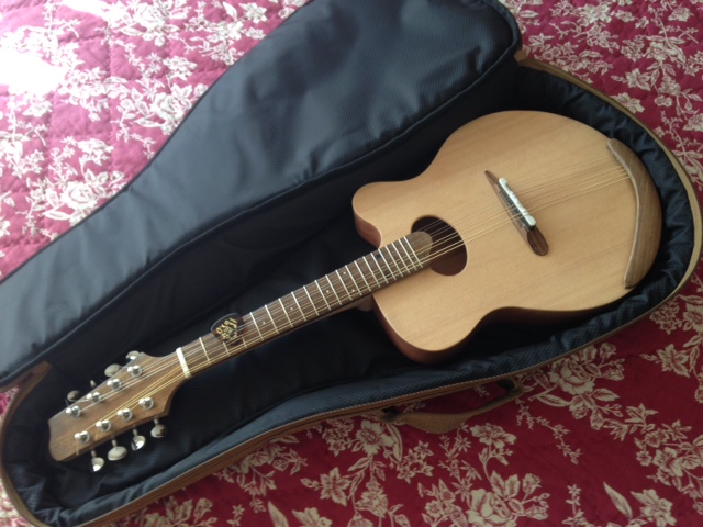 So awhile ago I came up with this little cut-a-way guitar-style mandolin design, and made a carved-top model, but what I wanted to do with this one was to use a conventional flat-top. The f-hole version I built first sounded amazing right after being strung up, but in time the top sagged and the tone died a horrible sonic death. So I tried this design, with x-bracing, and it sounds great. Bolt-on neck, radiused fretboard, tear-drop floating bridge. Body is mahogany, maple neck, with shidua head stock cover and integrated armrest. I’ll be making some more of these. Update – sold this one to Glen in Atlanta.