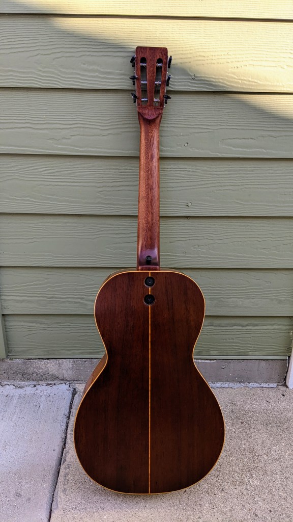 After the debacle of the last build, I decided to try again with a different design – a small-bodied acoustic that I could travel with. Something with a removable neck. The result is this Peruvian walnut and Sitka spruce parlor model. The lower bout is only 12″ wide but the scale length is the same as my Gibson L-00, with similar neck shape. For versatility, I installed a K&K Pure mini pickup – and the results are really good – it sounds like a larger guitar plugged in. I had someone ask why I put a slot head on it, and the answer is that I wanted the vibe to be like a parlor guitar from the early part of the 20th century, and many of those instruments had slots.